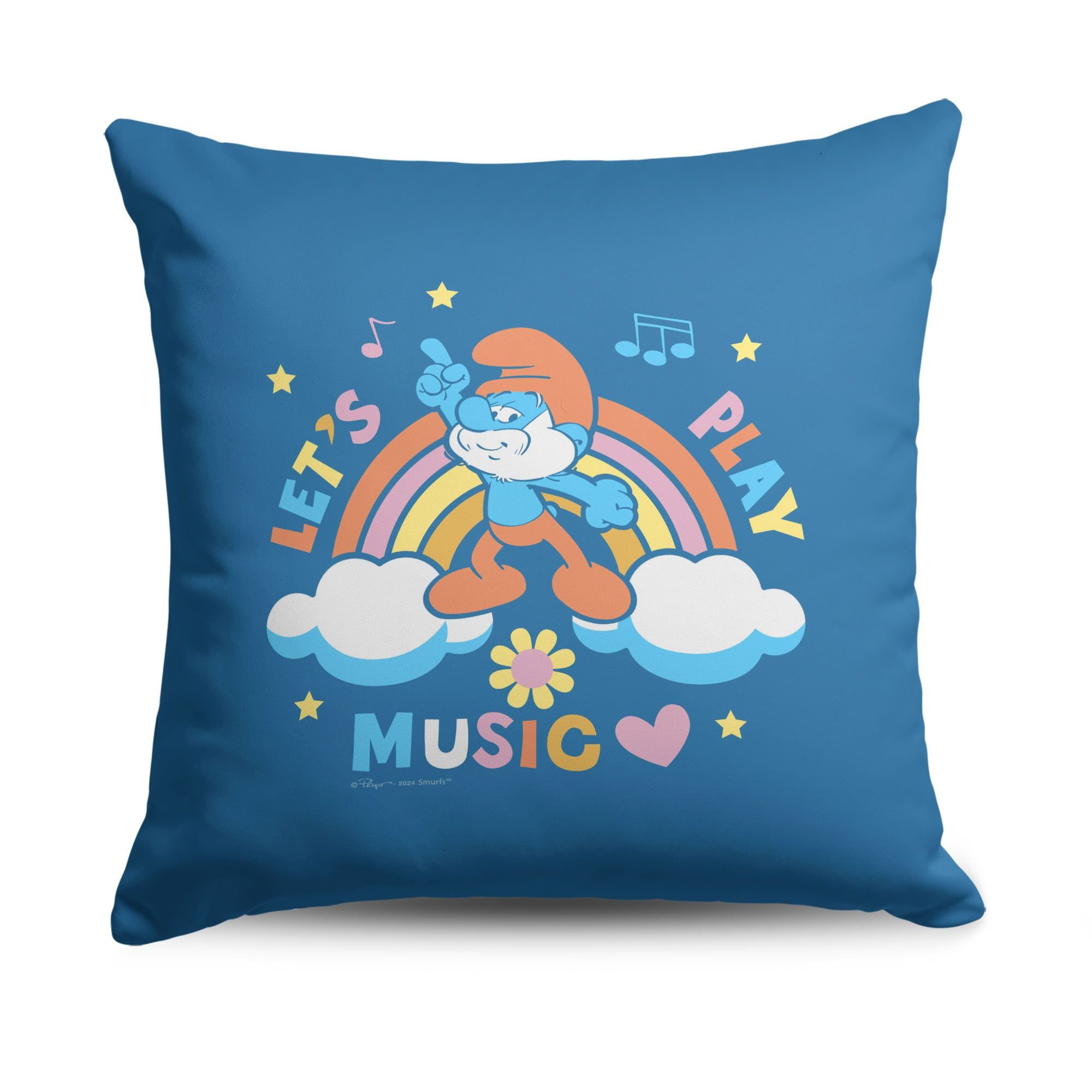 Bring on the good vibes with the Paramount Smurfs 'Let's Play Music' Silk Touch Throw Pillow, featuring a cheerful Smurf grooving to the beat in front of a colorful retro rainbow, fluffy clouds, playful music notes, stars, and a bright flower accent that pulls it all together. Inspired by the timeless joy and carefree fun of the Smurfs, this lively pillow instantly brings a splash of color and feel-good energy to any room, turning your bed, couch, or cozy corner into a happy jam session spot. The silky-soft fabric adds just the right touch of comfort, making it perfect for lazy afternoons, movie marathons, or simply brightening up your décor with a bit of nostalgic cartoon charm. Whether you're a lifelong Smurfs fan or just love to fill your space with playful pops of personality, this throw pillow is your invitation to kick back, turn up the tunes, and keep the good times rolling—one snuggle at a time.